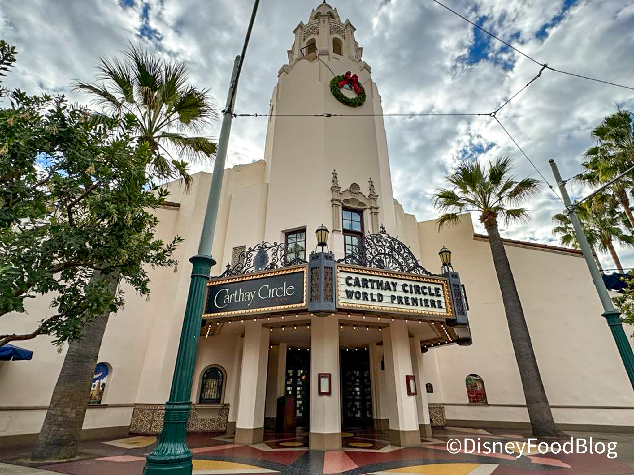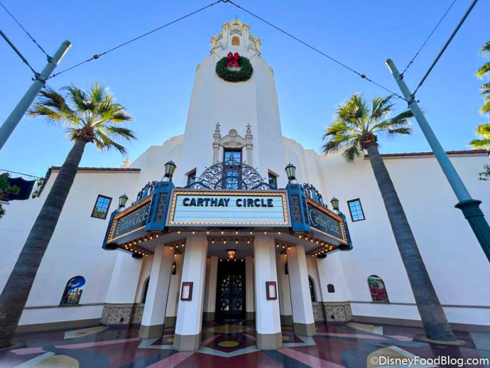 The exterior of Carthay Circle Restaurant features music, lights, and projection effects to “celebrate happy.”