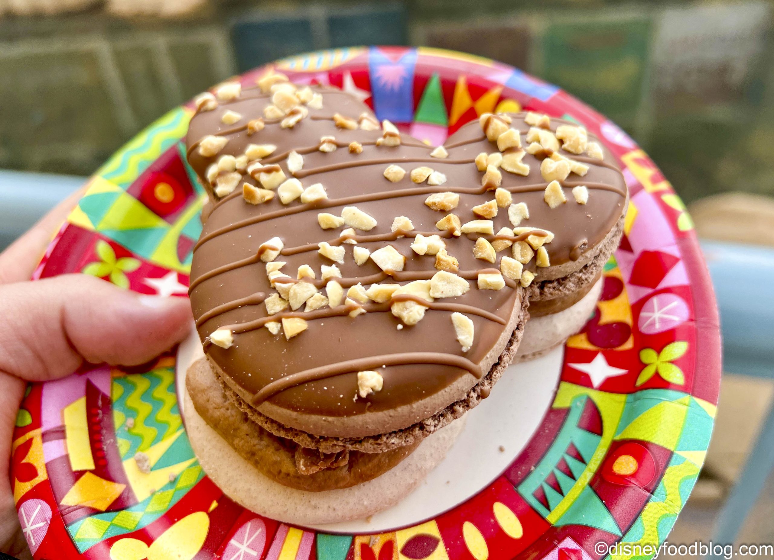 - Mickey-shaped macaron made with SNICKERS bar pieces: Chocolate Mickey-shaped macaron filled with caramel ganache made with SNICKERS bar pieces — $8.50