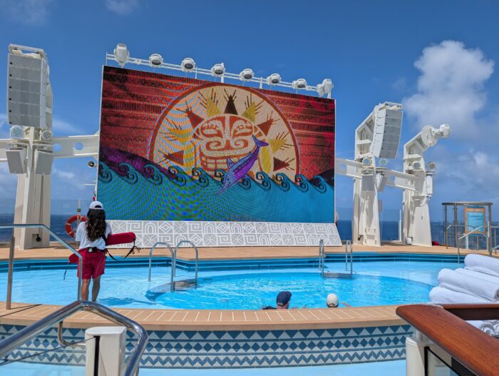 The Wayfinder Bay poolside retreat is complete with some of the ship’s best views! The space is inspired by Pacific Islands-inspired artistry of Moana.