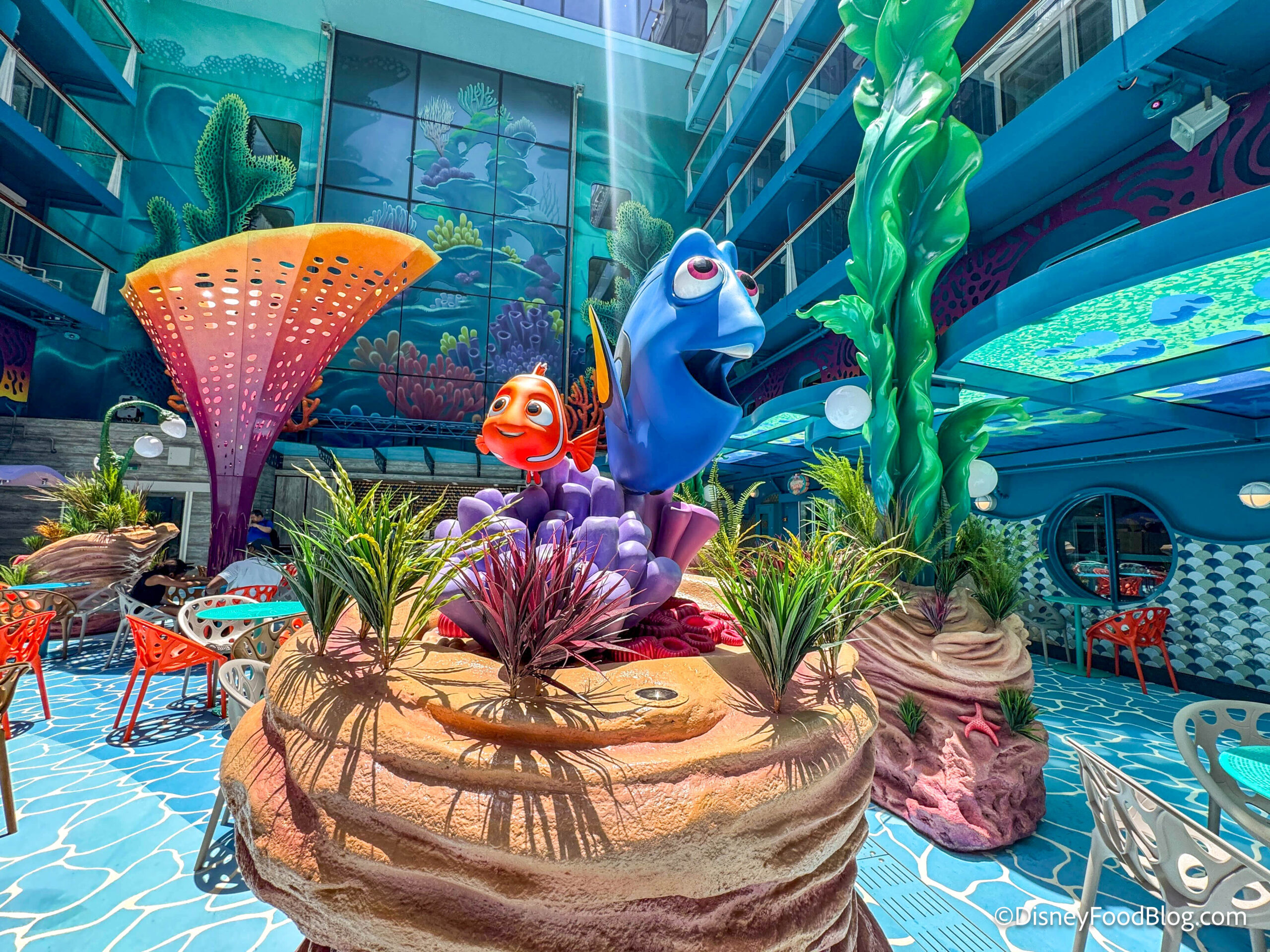 Disney Discovery Reef houses dining and shopping in an area that is themed to the “nautical worlds” of The Little Mermaid, Finding Nemo, Lilo & Stitch, and Luca.