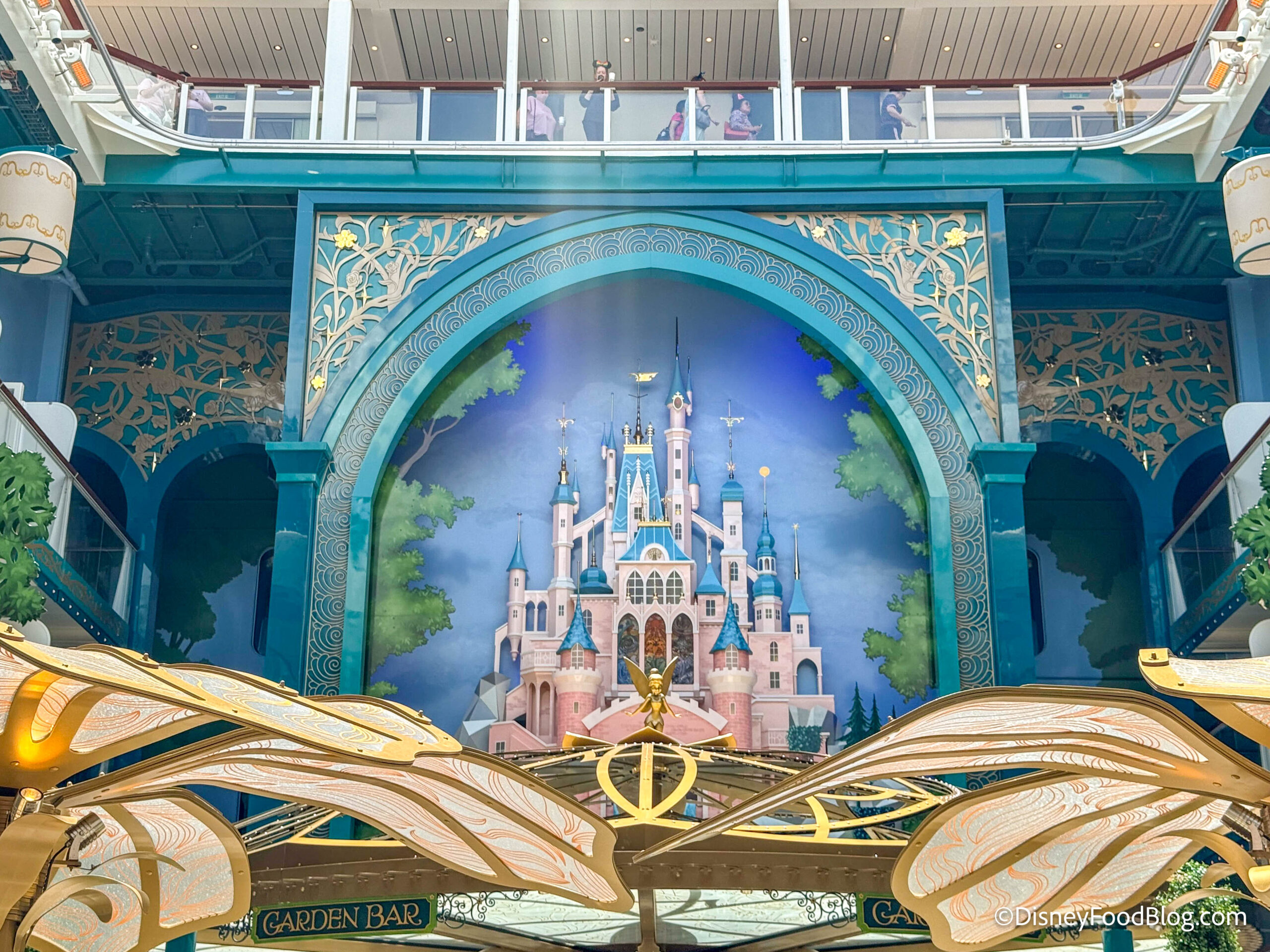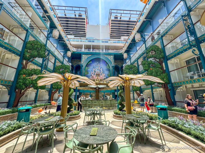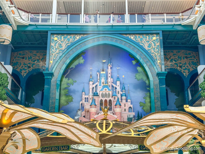 However, the true centerpiece of the courtyard is the three-deck-high castle artwork on the back wall. It’s inspired by castles from Disney parks and Disney stories and takes influence from sketches done by legendary Disney artists such as Herbert Ryman, Frank Armitage, and Eyvind Earle. It’s officially Disney Cruise Line’s first castle at sea!