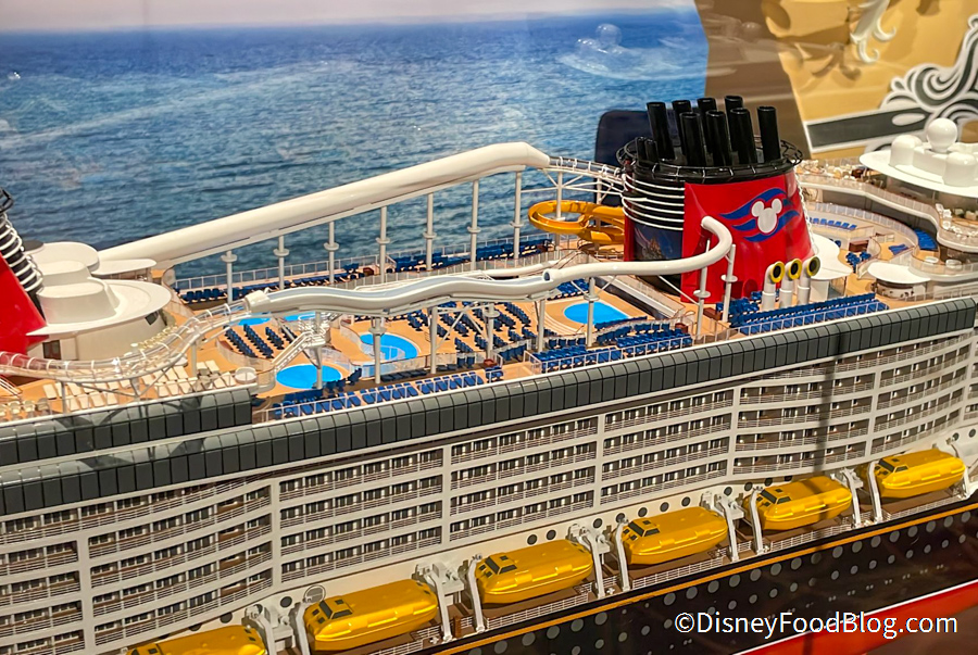 You’ll encounter Disney characters and sea creatures alike in a “wild water ride” that loops 760 feet around the upper deck. And, as you can see in the photo below, the ride even takes you sailing OVER the side of the ship in a completely clear tube for some unbelievable views!
