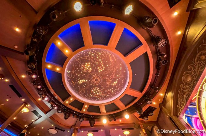 Located on Deck 3, you’ll dine in either the Walt or Roy Disney dining rooms, which present a Hollywood setting with “a dash of Disney whimsy.”