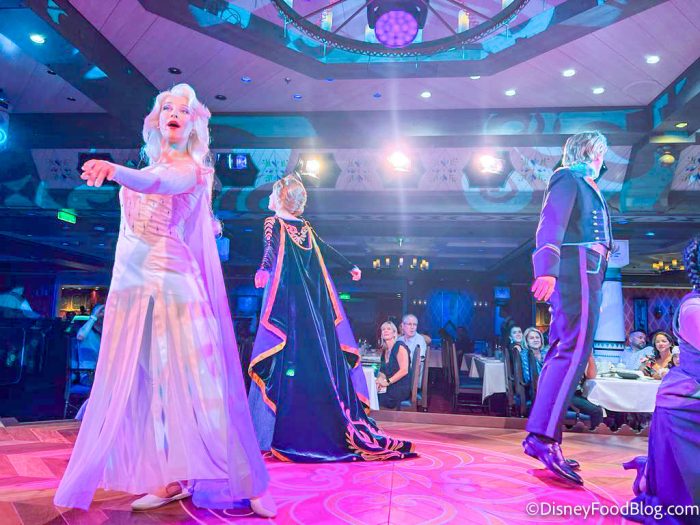 Guests enjoy the presence of Frozen characters performing LIVE during the meal in a beautiful dining room designed as the Arendelle castle’s Grand Ballroom!
