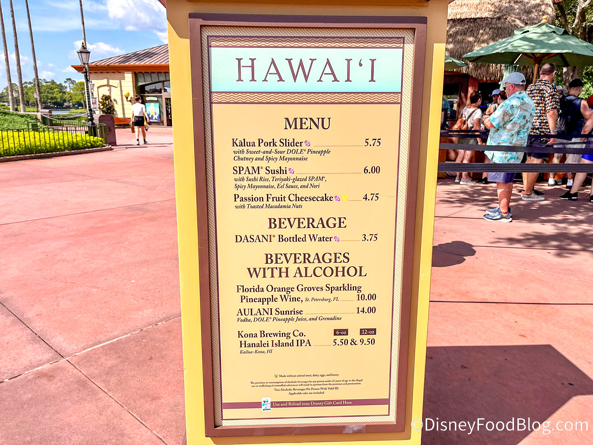 In real life 😉 , the logos are much smaller on the menus. This photo from an EPCOT Food and Wine Festival menus gives a good visual for how you’ll see the logo on display. (P.S. YES, you can use snack credits for many items at EPCOT’s seasonal Festivals!)
