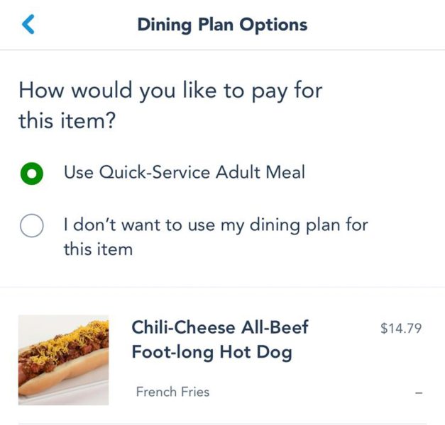 Conversely, if you want to Mobile Order and pay out of pocket NOT using your Disney Dining Plan credits, you can do that as well. You’ll just need to click “Modify” when reviewing your order and select “I don’t want to use my dining plan for this item.”