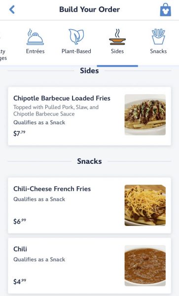 If you’re using Mobile Order in Disney World’s My Disney Experience app, you’ll find items designated as those that are Snack Credits eligible. For example, in the screenshot below from Casey’s Corner on Mobile Order, the Chili-Cheese French Fries do NOT count as a snack credit eligible item; however, the Chili, French Fries, and Baseball Brownie all have the “Qualifies as a Snack” designation.