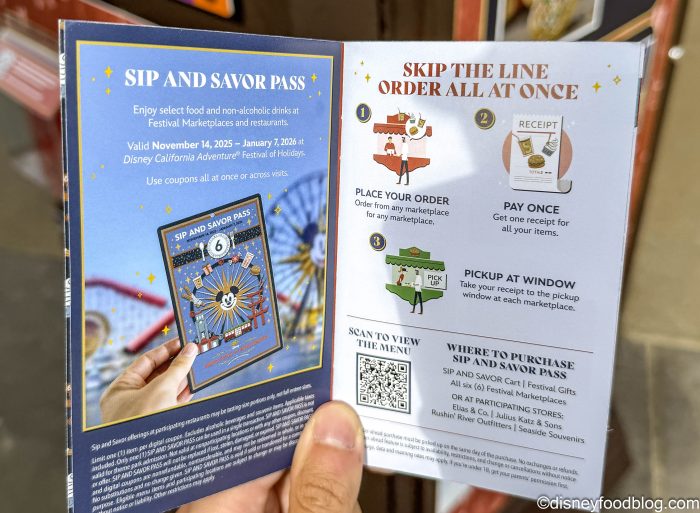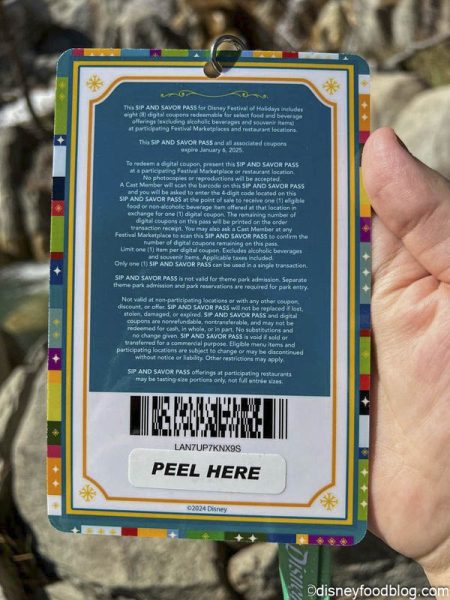 The Sip and Savor Pass is once again available to Festival guests! For the cost of$46 per guest (or $43 for Magic Key holders and Cast Members), you’ll receive 6 digital coupons on a lanyard that can be redeemed at the Festive Foods Marketplaces for one food item or non-alcoholic beverage each.