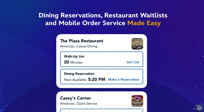 Essentially, the Dining Tip Board combines several of the existing features of the My Disney Experience app and the Disneyland Resort app into one spot where you can see all of the next windows for Mobile Order Pick-Up Times, Walk-Up Waitlist waiting times, the next available reservation time for each restaurant, and more.