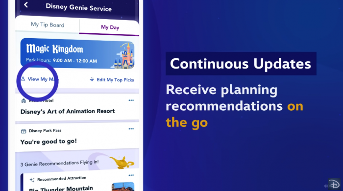 Disney Genie is a complimentary service within Disney World’s My Disney Experience app and the Disneyland app. Disney Genie provides on-the-go planning tools and customized itineraries to help guests maximize their time in the Disney World theme parks: Magic Kingdom, EPCOT, Disney’s Hollywood Studios, and Disney’s Animal Kingdom.