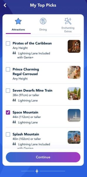 From here, you can “tell the Genie your wishes” — or your Top Picks — when it comes to three major categories: Attractions, Entertainment, and Dining! In our example, we have chosen EPCOT as the park we are visiting. You can scroll through the entire list under the Attractions icon and add a check to all of your Must-Rides.