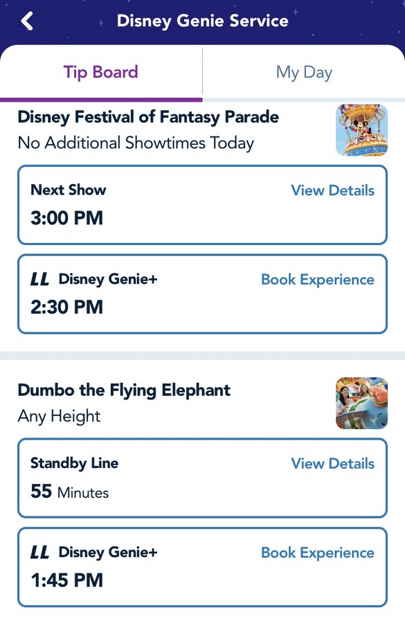 Disney Genie is comprised of two major sections: My Day and the Tip Board.