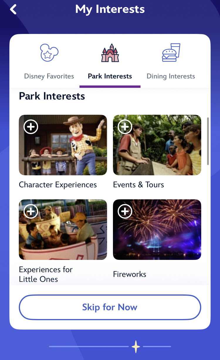Use Park Interests to identify specific types of experiences that apply to or are of interest to your group, such as Experiences for Little Ones, Thrill Rides, Parades, and Seasonal Offerings.