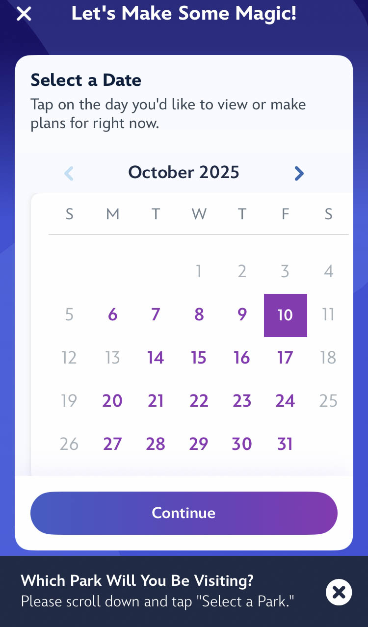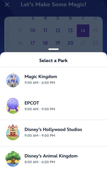 To begin crafting your day in the park, select “Start Now.” From here, you will select the date of your park visit first: