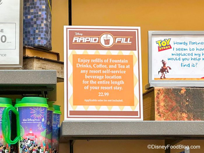 The Rapid Fill program allows Disney Resort guests to buy a Resort mug that can be refilled for a certain period of time, as designated at the time of purchase. Guests participating in the Disney Dining Plan also receive one per person as part of the package.