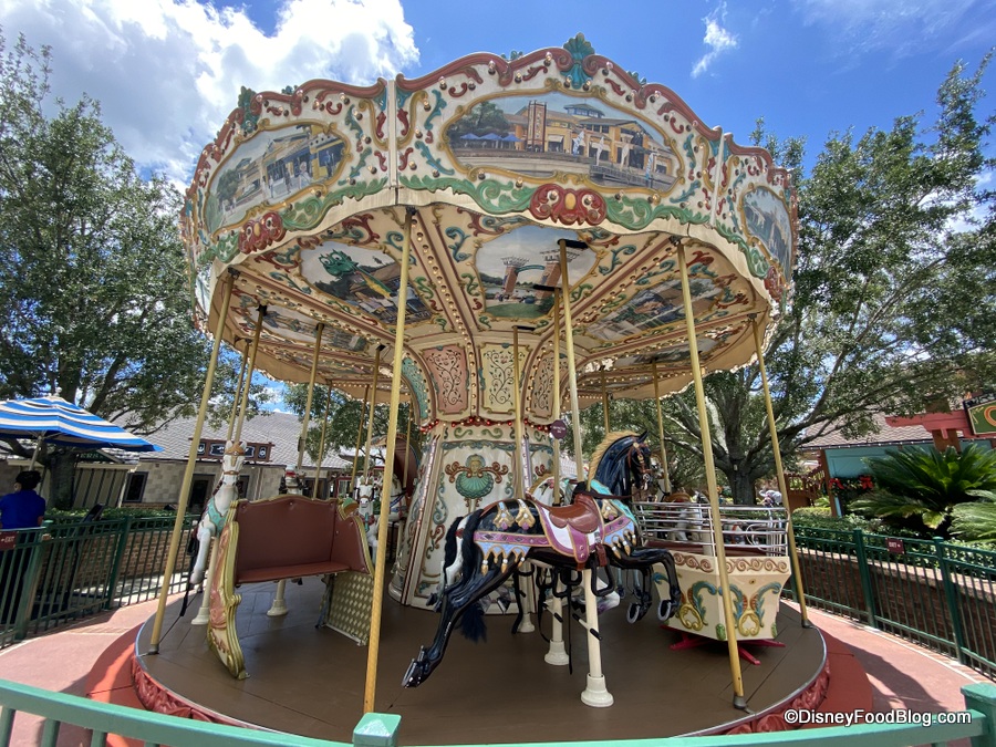Did you know that there are rides outside of the Disney World theme parks? The charming Marketplace Carousel features 16 hand-crafted horses, two seated carriages, and a spinning teacup.