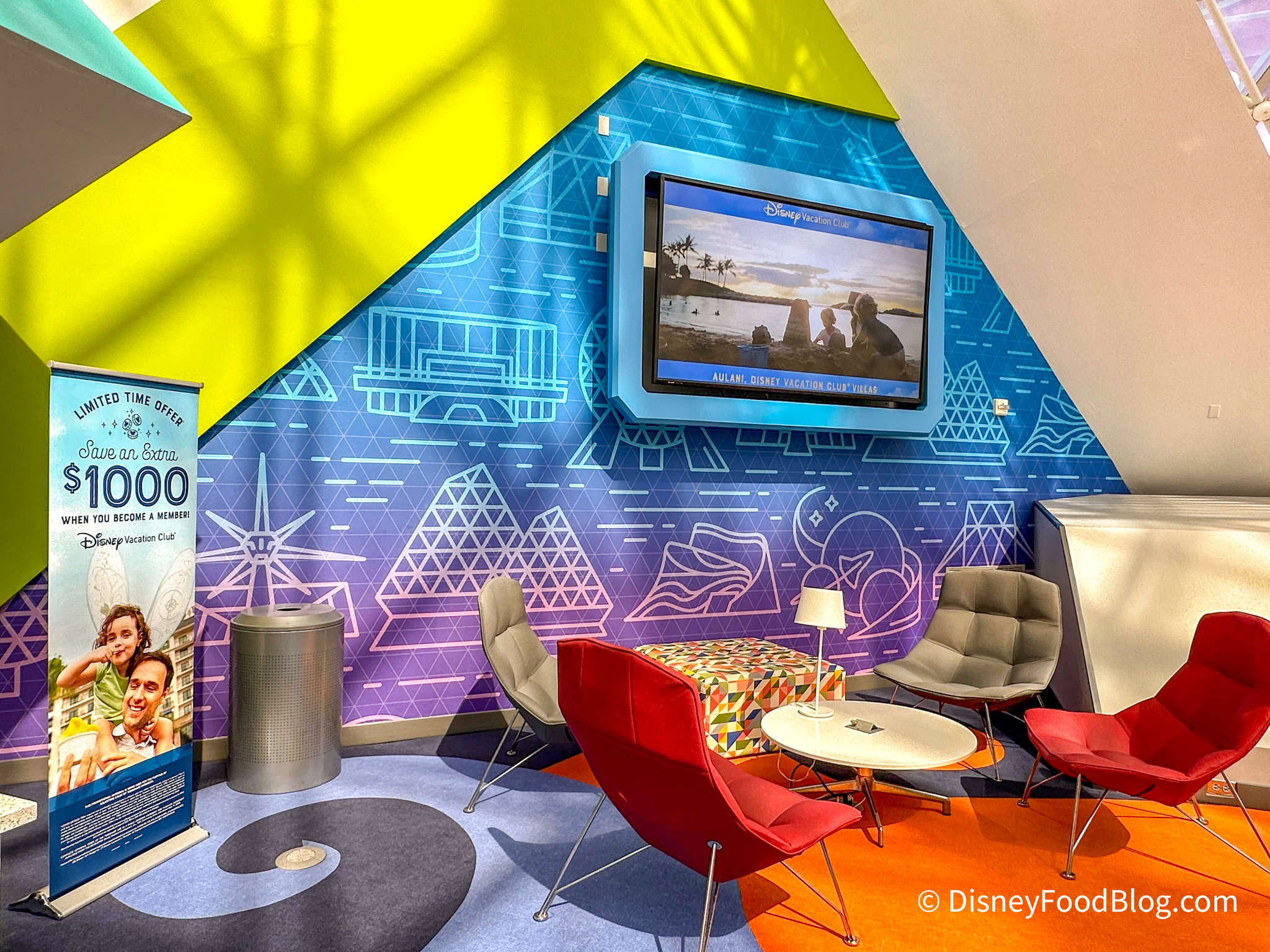 New murals within the lounge were designed by Disney Legends like Mary Blair, John Hench, and Herbert Ryman. Here, members will find a “dedicated Disney Vacation Club Member Services team,” free Wi-Fi, charging stations, and complimentary beverages.