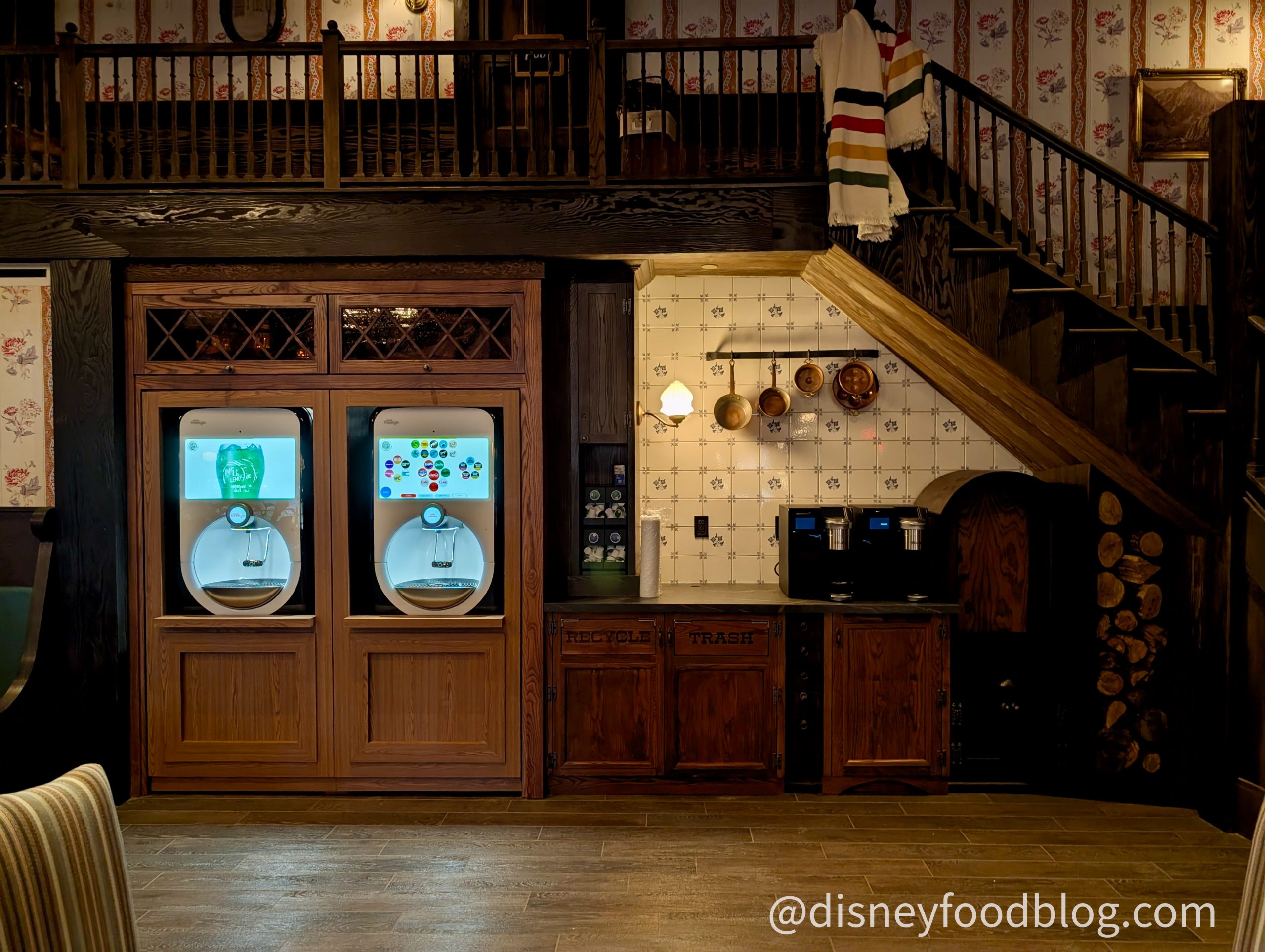 Inside, you’ll find plenty of air-conditioned seating, plus a Coke Freestyle machine and other beverages, WiFi, and plenty of places to rest and recharge — literally. There are outlets built into some of the tables here. The story of this lounge is that you’re traveling and stopping in at McKim’s roadhouse for a rest. They still live here (you can see their family quarters on the inaccessible second floor).