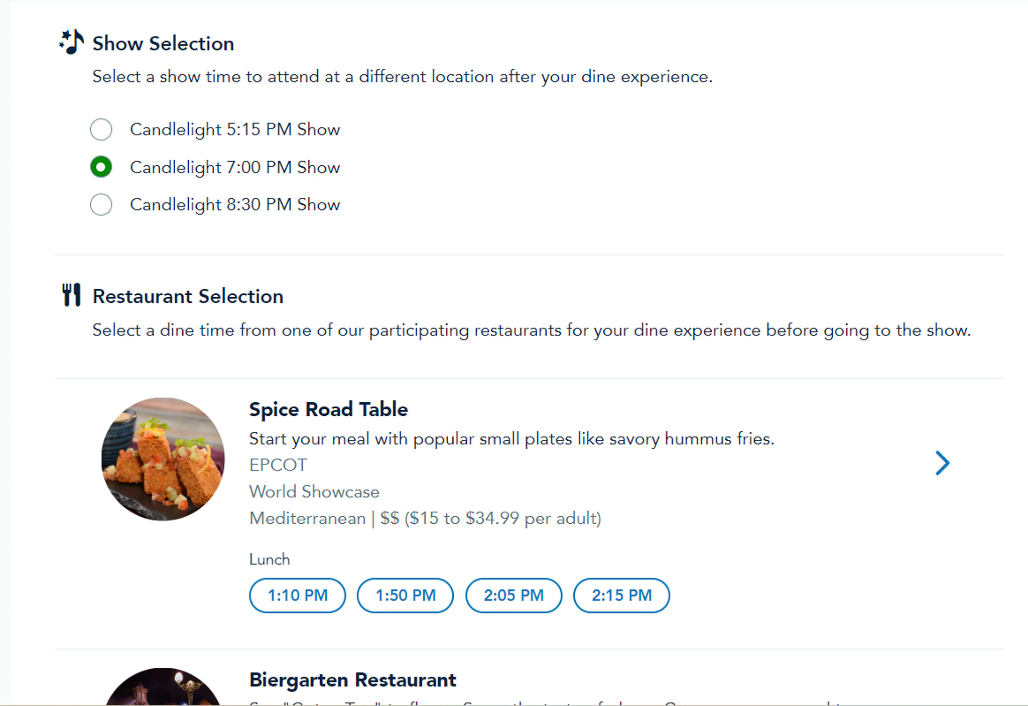 When booking online or through the My Disney Experience app, guests will select a specific showtime before choosing which restaurant they wish to reserve. (You will not be able to view the available dining times at the participating restaurants until you choose a showtime.)