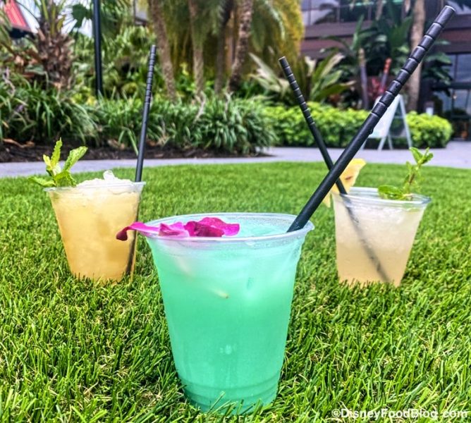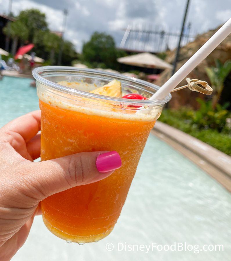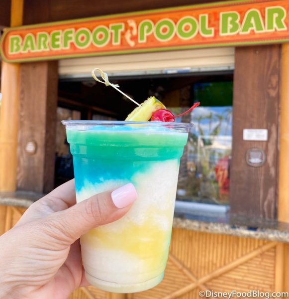 If you visit the Barefoot Pool Bar you’ll find an item on the menu called The Voyager. And guess what? This colorful cocktail started as a DFB Hack based on the non-alcoholic Kakamora Float — one of our favorite snacks in Magic Kingdom — and turned into a Secret Menu item known as the Spiked Kakamora!