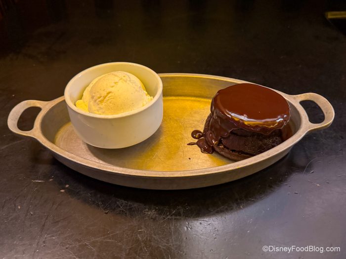 You get a warm flourless chocolate cake served a la mode with two scoops vanilla ice cream on the side. This is a deliciously dense spongey cake with ganache on top, so it’s rich and decadent. It just goes to show that you don’t need a dining reservation for a table service restaurant when you get some of your favorite table service menu items at the lounge!