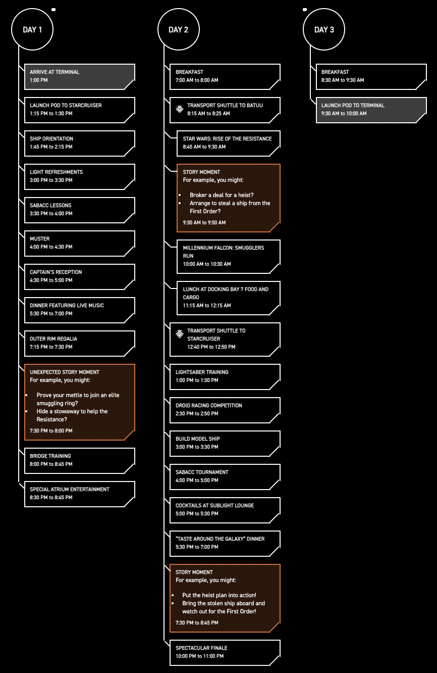 Disney has provided a Sample Itinerary showing when passengers might experience the various activities. (Simply click the image below to enlarge.) As you will see, the experience will include “Story Moments.” This means that depending on who you meet and interact with, your Star Wars story may change!