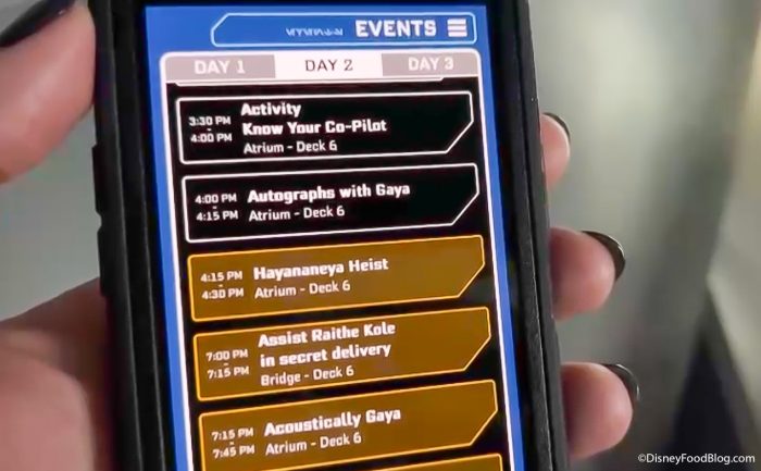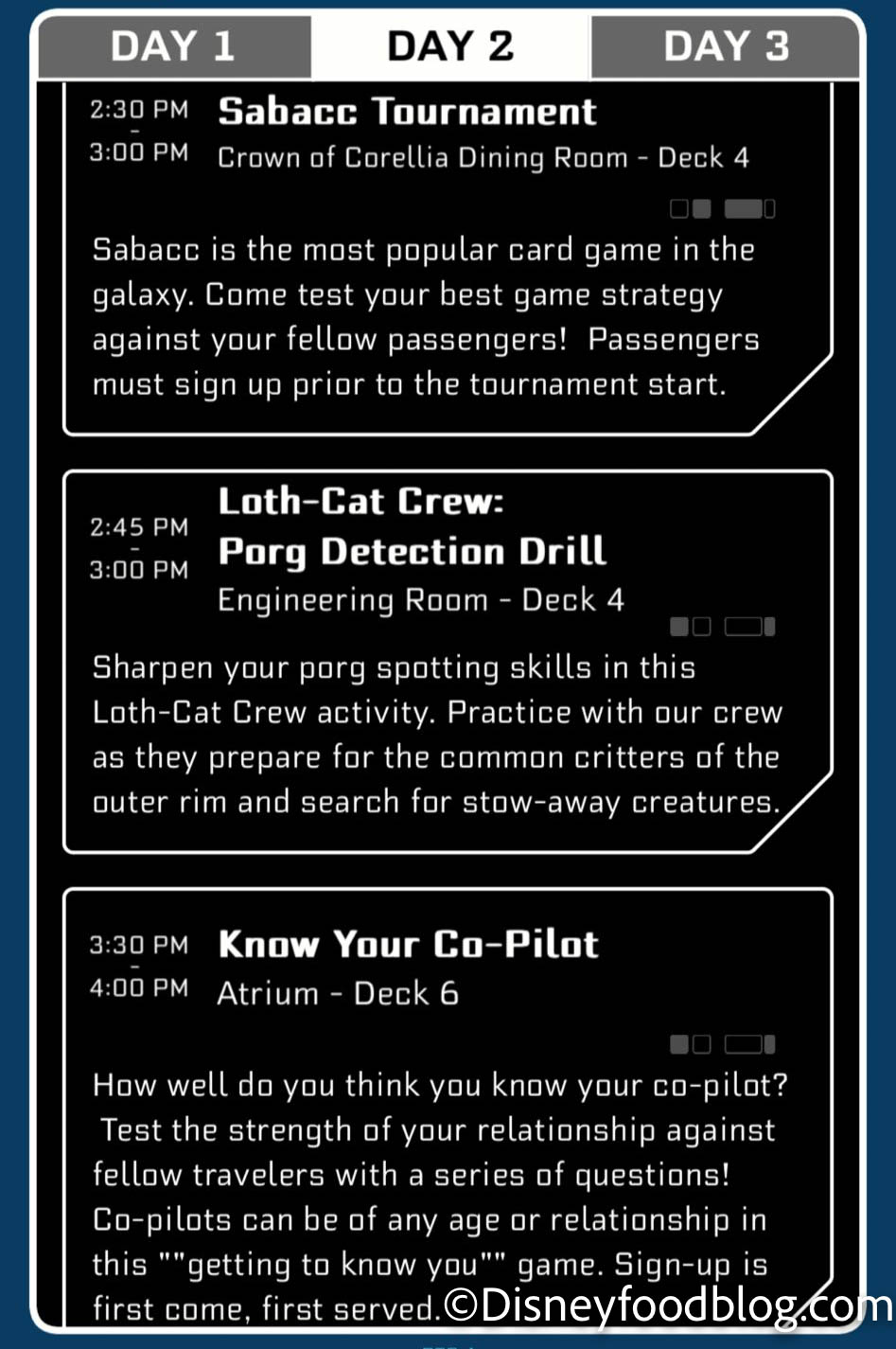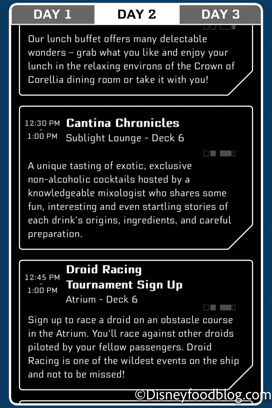 After arrival on Day 1 (any time from 1PM-4PM), things start off with a lunch buffet in the Crown of Corellia Dining Room. Passengers are also given time to explore the ship during that window. Also in the afternoon is a Datapad Orientation and a Galactic Social.