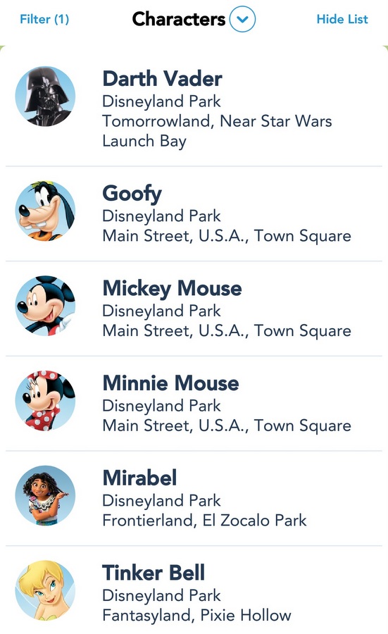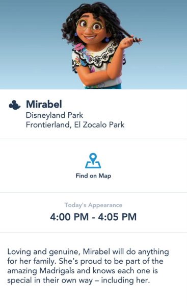 For instance, if you would love to say “Hello!” to Mirabel from Encanto, simply touch the screen where you see her name on the list in the app, and you’ll find appearance times listed.