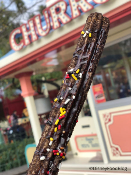 - Mickey Mouse Celebration Churro — Warm chocolate churro drizzled with cookie butter topped with Mickey confetti and served with a side of red marshmallow crème and classic Mickey buttons