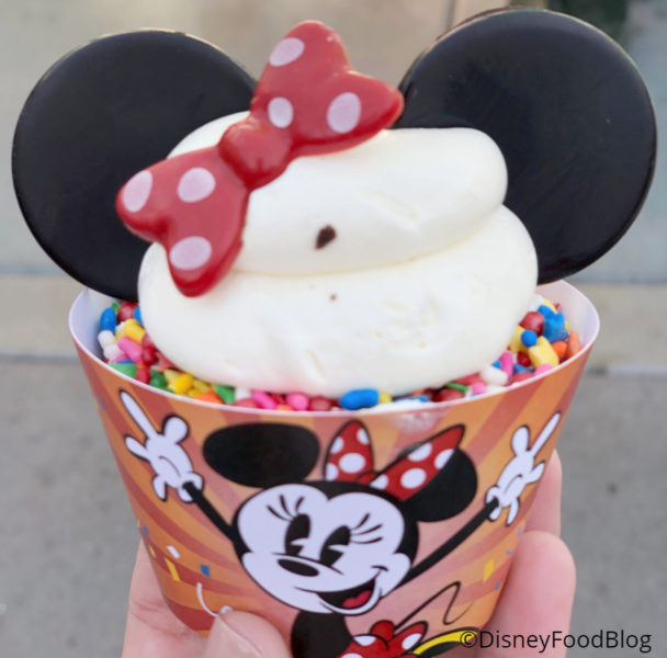 - Minnie Chocolate Chip Cookie Cupcake – topped with buttercream frosting, birthday sprinkles, chocolate ears, and a red bow