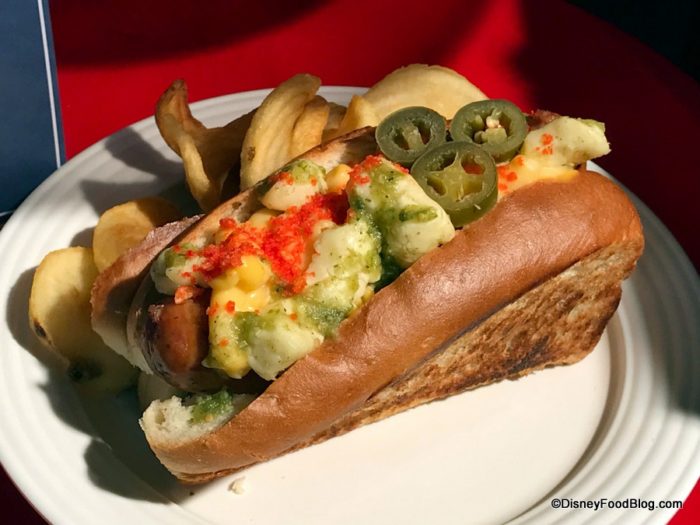 - A Cheesy Celebration – Cheddar sausage link with creamy mac and cheese, salsa verde, crumbled spicy cheese puffs, and cheese curds on a toasted bun