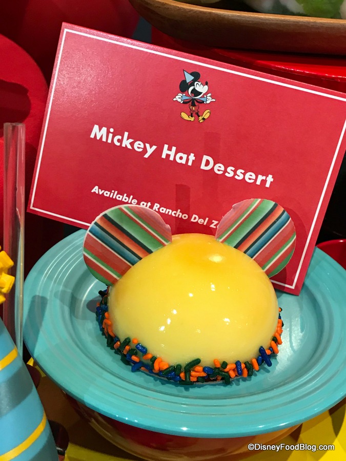 - Mickey Hat Dessert – Vanilla mousse dome with churro crunch filling, mango glaze, and striped Mickey ears