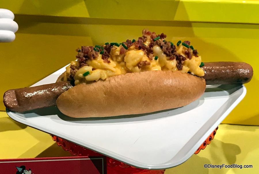 - Bacon Mac & Cheese Footlong Hot Dog – topped with creamy bacon mac and cheese and served on an Italian roll