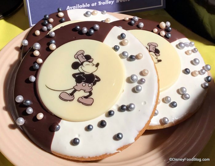 - Steamboat Willie Black and White Cookie — Butter shortbread cookie dipped in white and dark chocolate with silver crunch pearls