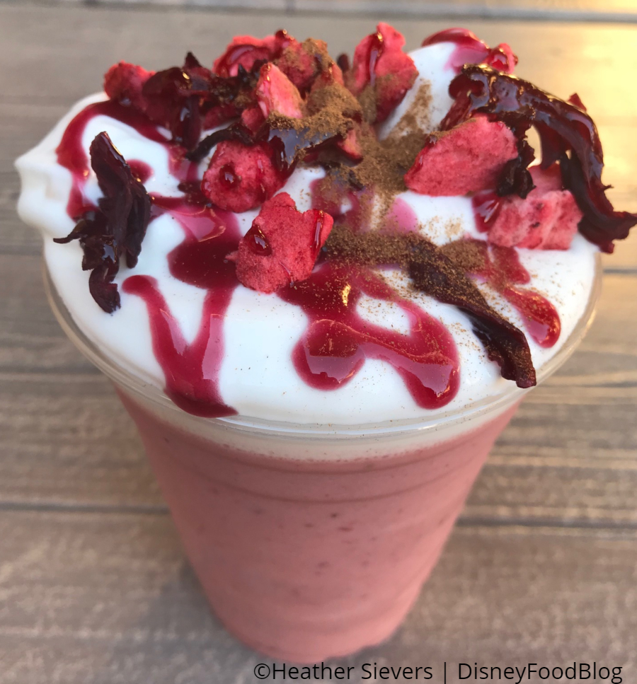- Frozen Strawberry Horchata – flavored with strawberry and topped with whipped cream, a dehydrated strawberry, and a sprinkle of cinnamon