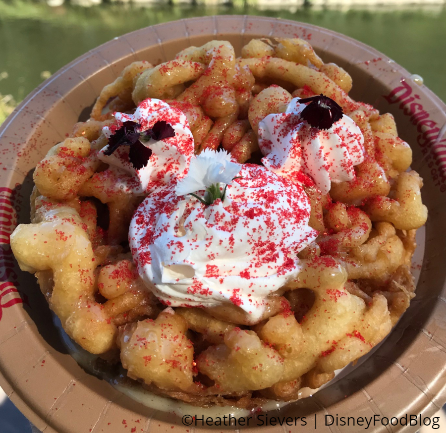 - Celebration Cake Funnel Fries – Funnel cake fries topped with crumbled confetti cake, frosting, whipped cream, and Mickey sprinkles