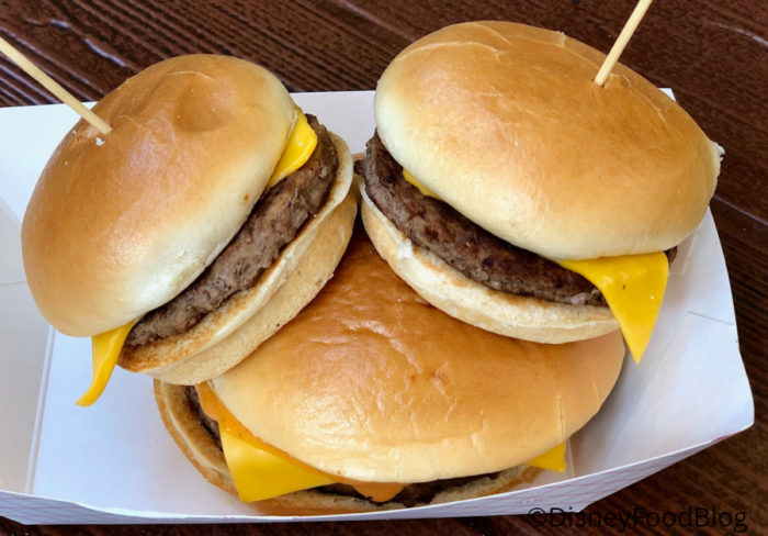 - Mickey-inspired Cheeseburger — 1/3 lb. Angus patty with burger sauce and lettuce on a red potato bun with black sesame seeds
