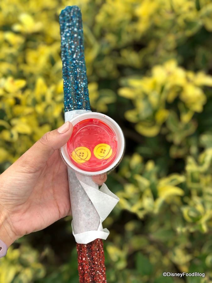 - Fantasia Mickey Churro – Warm chocolate churro dusted with red and blue sugar served with a side of red marshmallow crème and Sorcerer Mickey hat