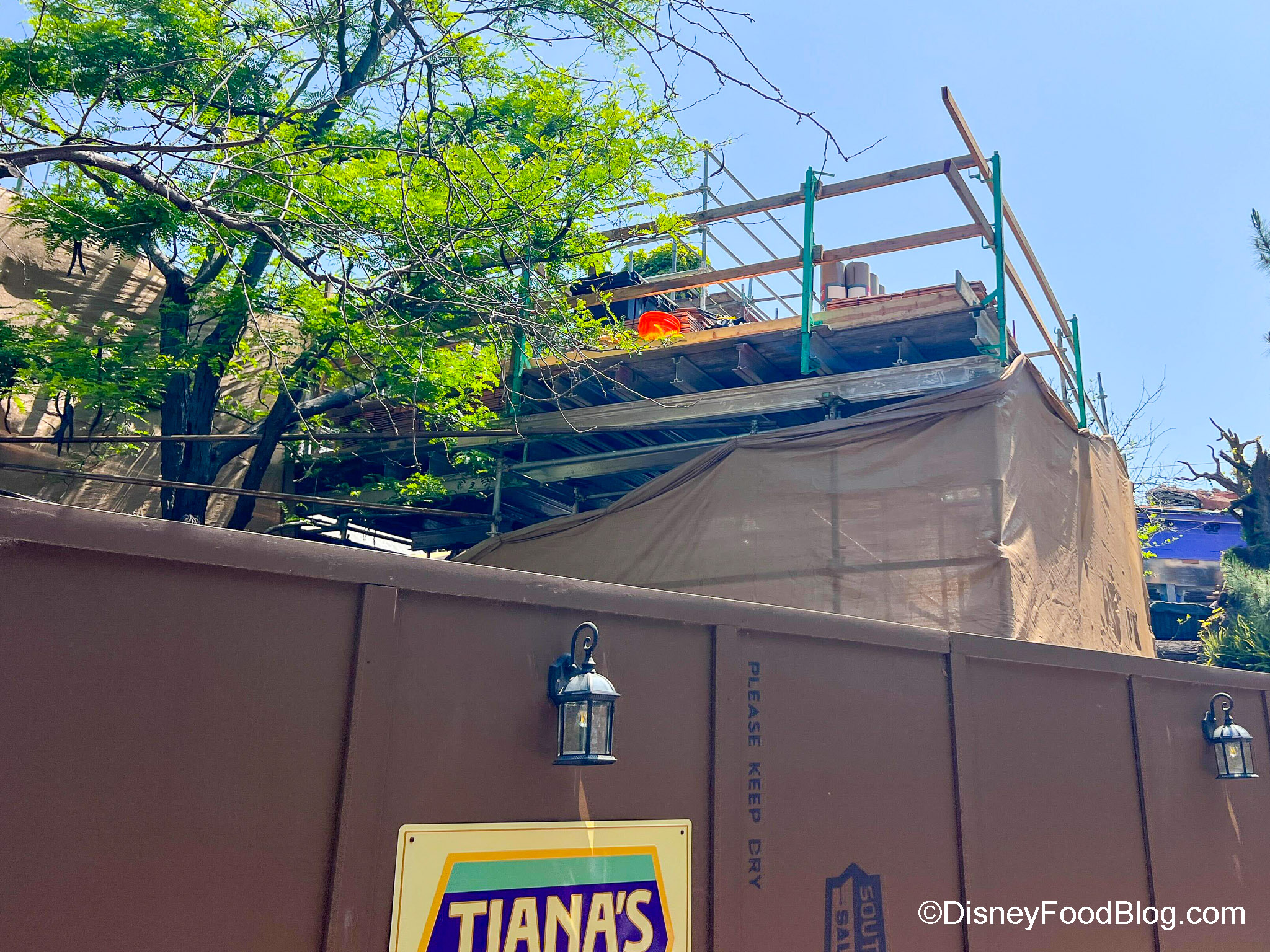 - Tiana’s Bayou Adventure: new scaffolding structure close to the construction walls by the ride entrance and line