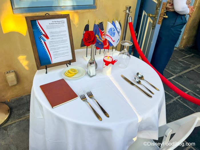 - Tribute tables set up for Memorial Day at Cafe Orleans, Tiana’s Palace, and Blue Bayou