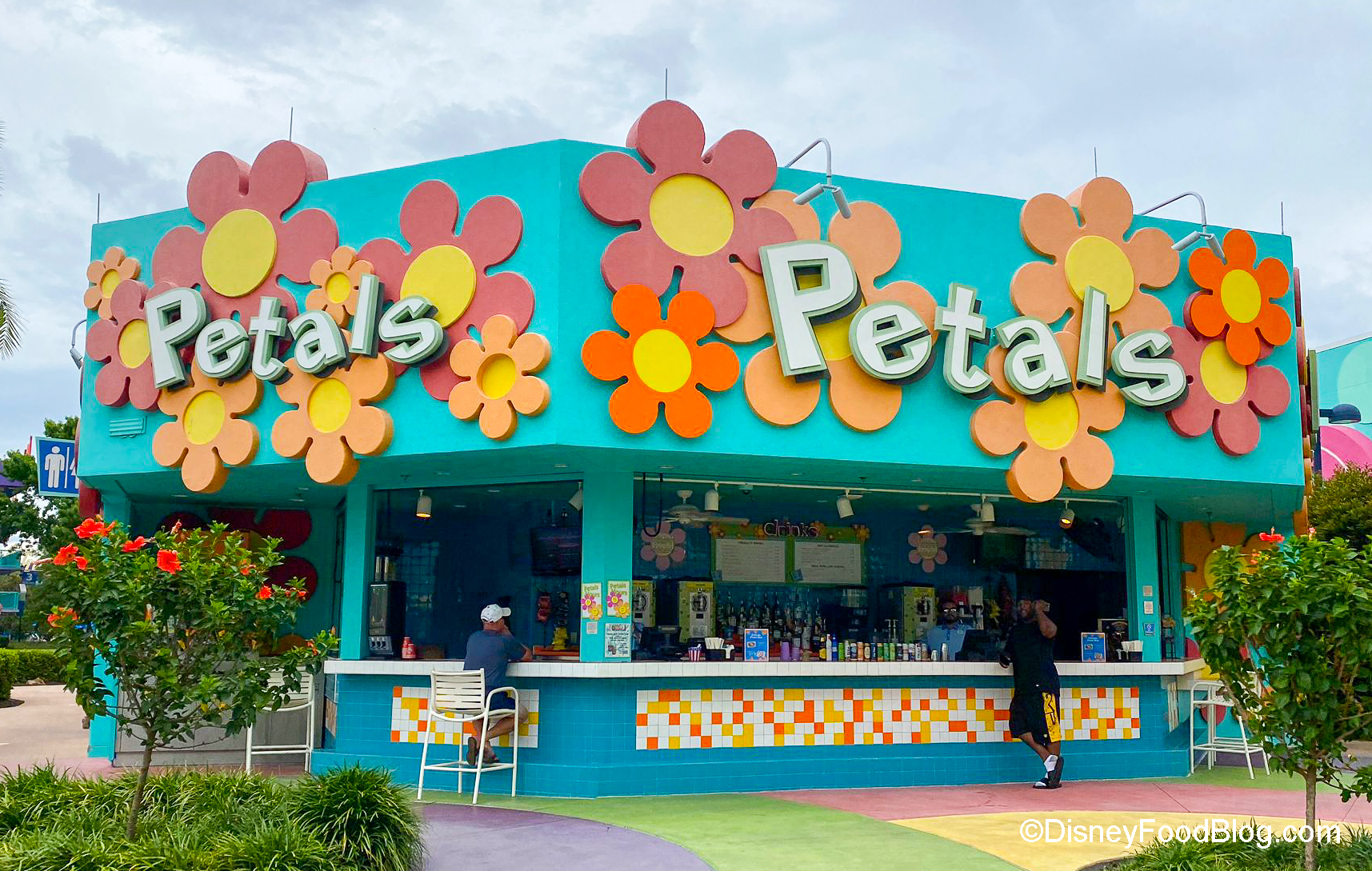Petals Pool Bar at the Hippy Dippy Pool offers all the standard Disney Pool Bar offerings, with a few unique additions: specifically, the Lava Lamp and the Hula Hoop cocktails!