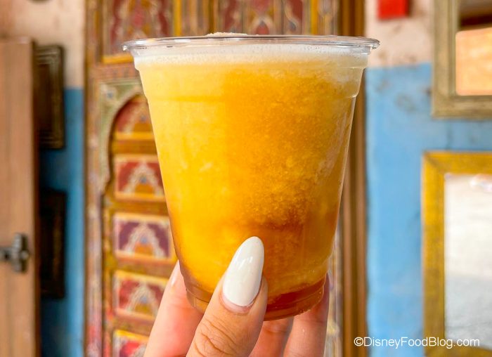 Now let’s head over to Oasis Sweets & Sips in Morocco. And here’s what you want to get: the Frozen Mint Tea. It’s a frozen mint tea (no surprise there) with Bombay Sapphire Gin. And it is one of the best boozy drinks to have when you need to cool off at Disney World.
