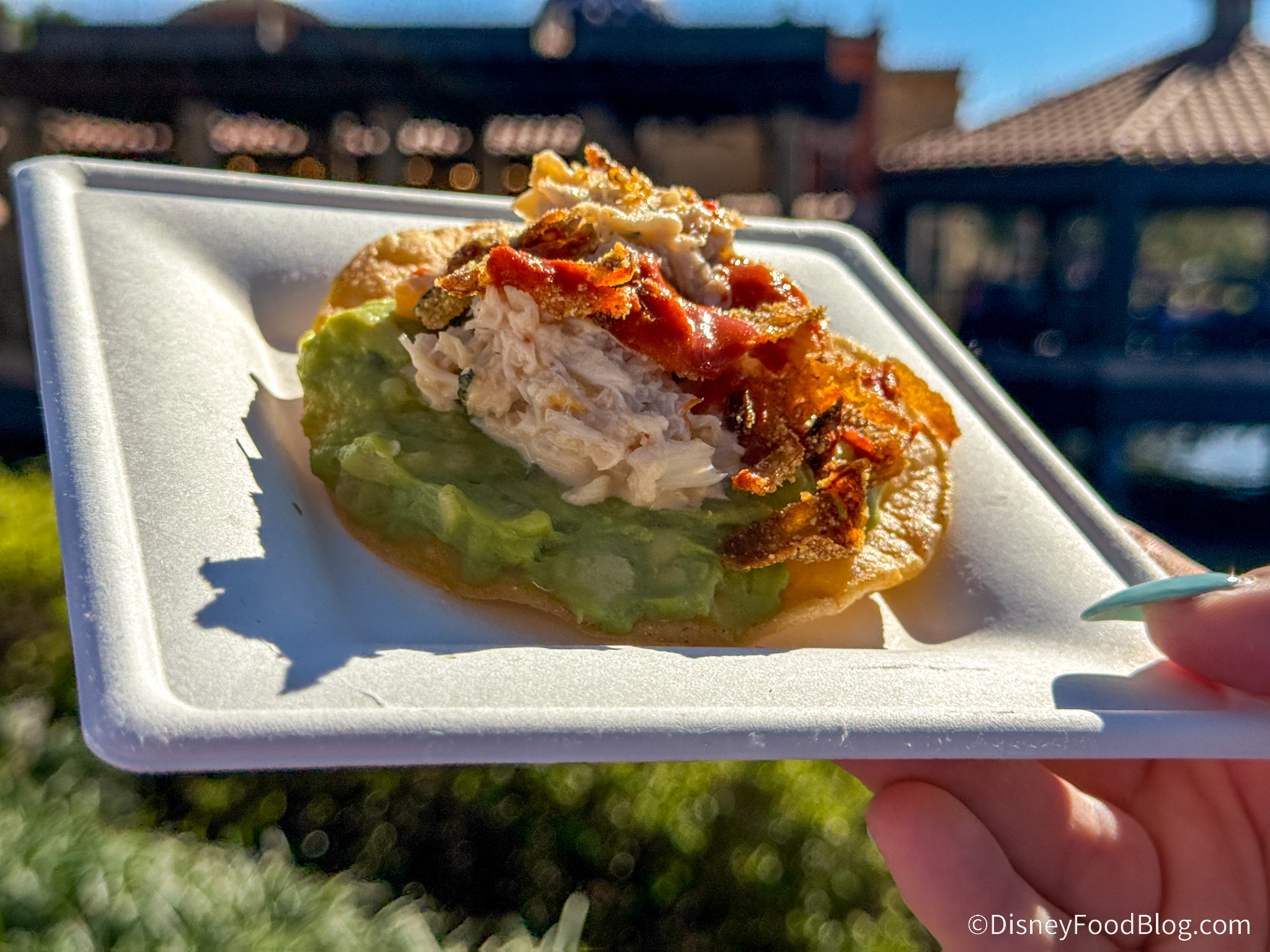 - Tostada de Cangrejo: Crispy corn tortilla topped with guacamole, lump crab, mango, crispy onions, and hot sauce (New) — $9.50, DDP Snack Eligible