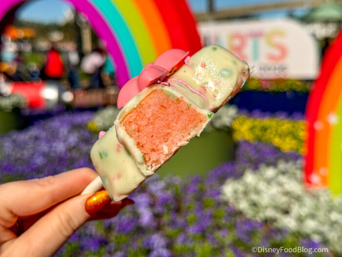 - Liquid Nitrogen Minnie Cake Pop with cotton candy sponge cake, white chocolate ganache, and colorful chocolate splats (New) (Wonderful Walk of Colorful Cuisine eligible item) — $4.79, DDP Snack Eligible
