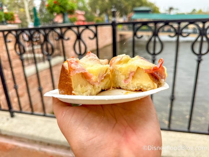 - Toasted Pretzel Bread topped with black forest ham and melted cheese — $6.00, Disney Dining Plan snack credit eligible