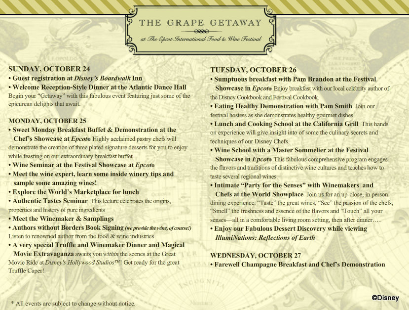 The Grape Getaway includes a specialty vacation for foodies and wine lovers running from October 24th-October 27th, 2010. Here are the details: