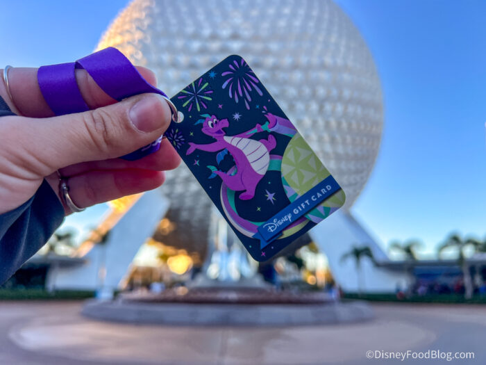 Worried about juggling your wallet or purse while doing a balancing act with your food and drinks from the Food Studios? You can get a wristlet/ring Disney Gift card at merchandise locations throughout the park!