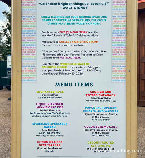The Wonderful Walk of Colorful Cuisine gives guests the chance to sample several items at the Food Studios during the Festival! Guests purchase five of the seven designated items at various food booths, receiving a stamp in their Festival Passport for each item.