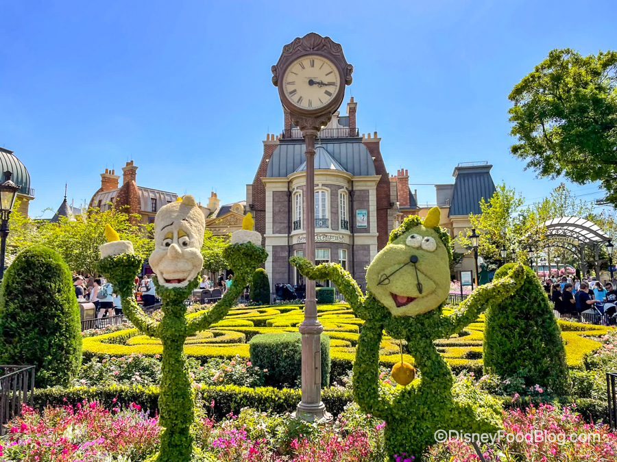 More character topiaries include Snow White and the Seven Dwarfs at the Germany pavilion and Lumiere and Cogsworth welcoming you to the France pavilion.