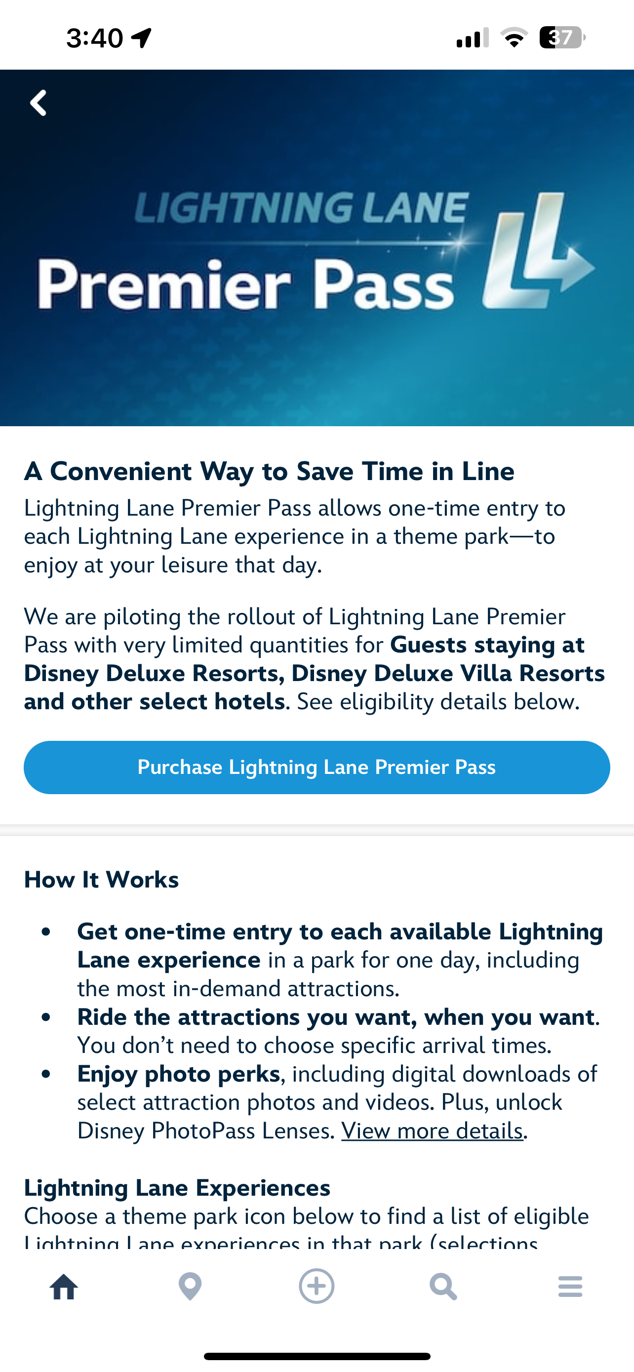 To purchase Premier Pass, open your My Disney Experience app, and you’ll see “Lightning Lane Premier Pass” on the home screen. (If it does not show up, you can search for it in the app.) Next, tap “Purchase Lightning Lane Premier Pass”.